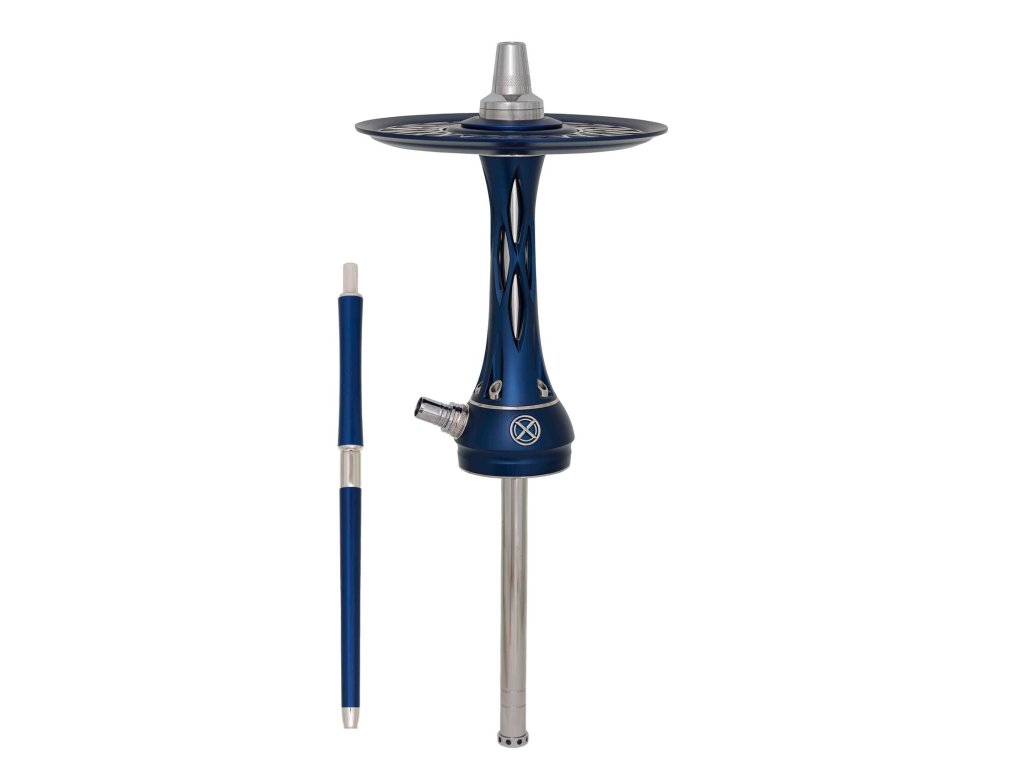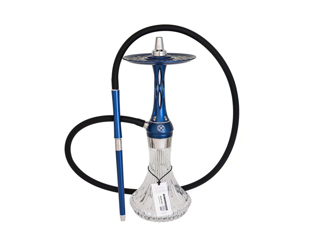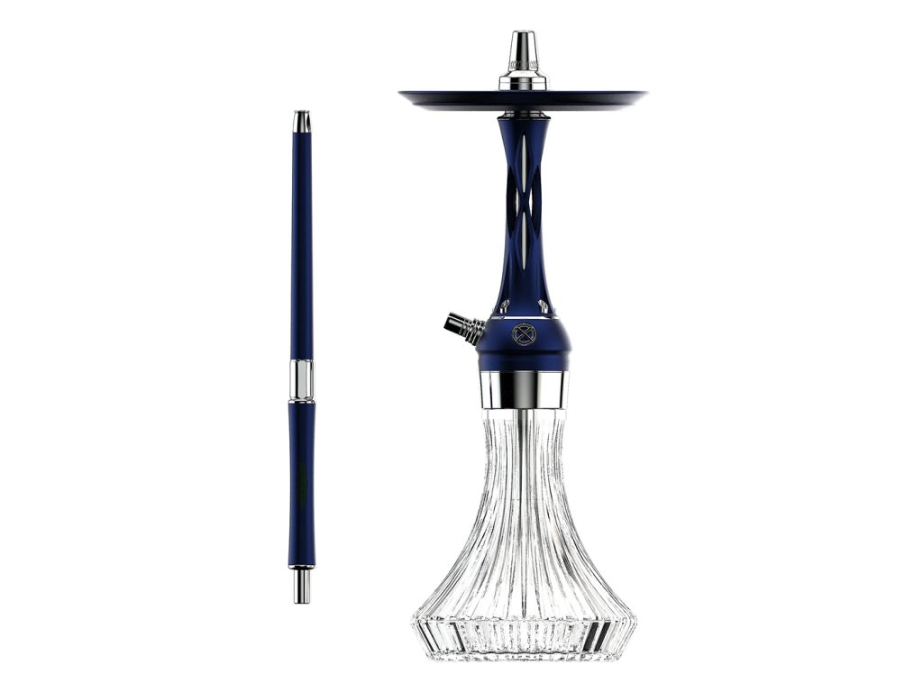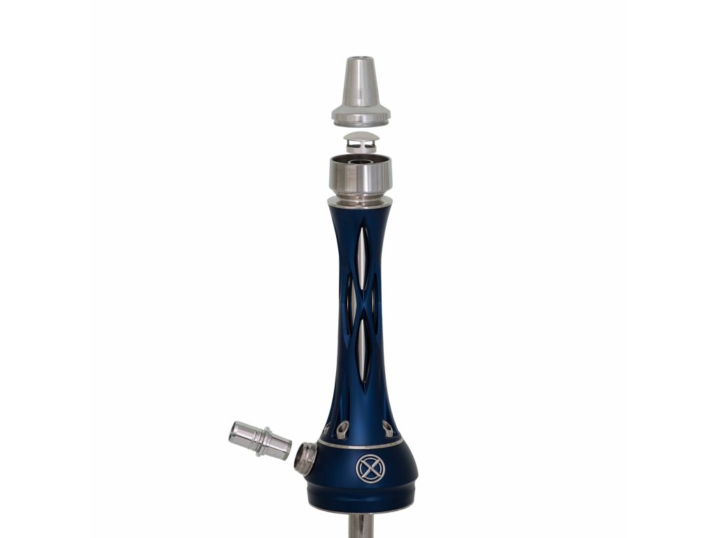 Tělo vodní dýmky, dřík a integrovaný zachytávač melasy jsou vyrobeny z nerezové oceli AISI 304 s povrchovou úpravou PVD, což zajišťuje maximální odolnost, čistotu chuti a dlouhou životnost. Dekorativní prvky jsou z eloxovaného hliníku a doplněny barevnou texturou Deep Blue, která dodává dýmce výraznou estetickou hodnotu.