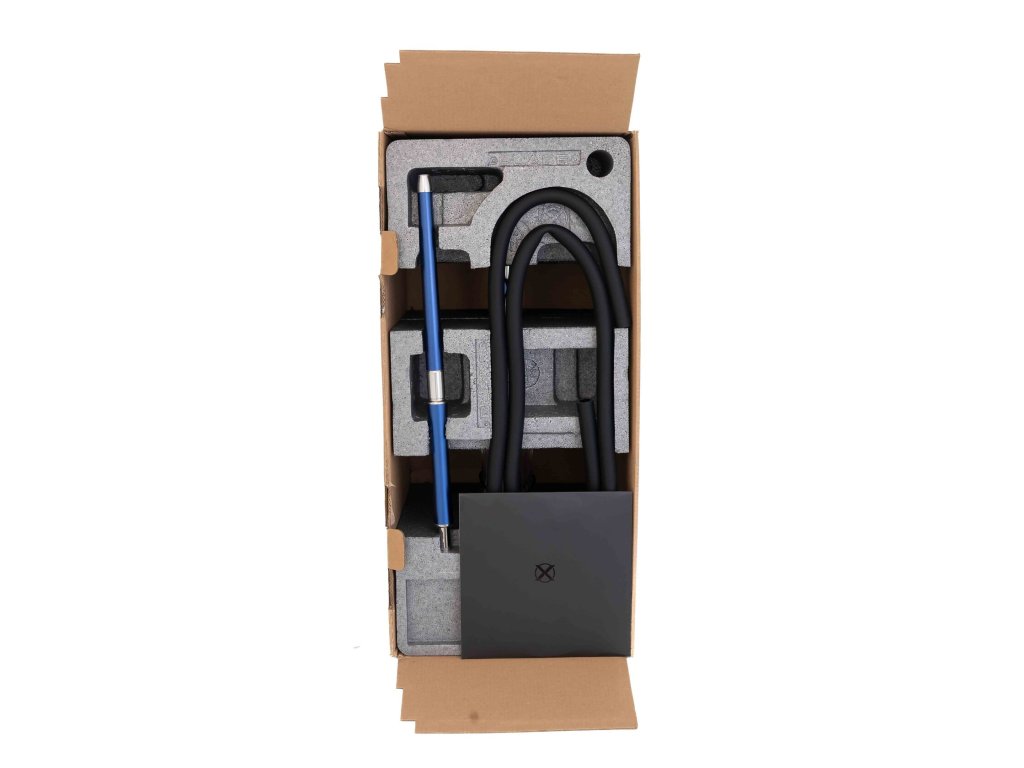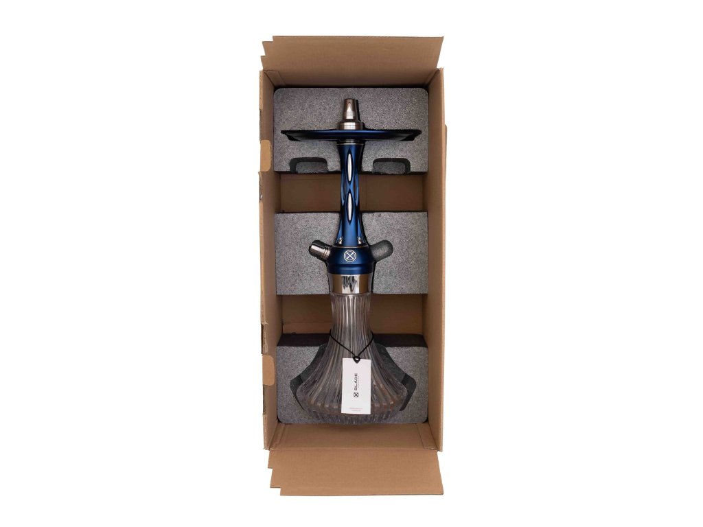 Součást balení: tělo dýmky, váza Blade Glass Bottle, talířek 18 cm, integrovaný zachytávač melasy, magnetický konektor a port hadice, šroubovací difuzor, těsnění a spojovací prvky, hadice