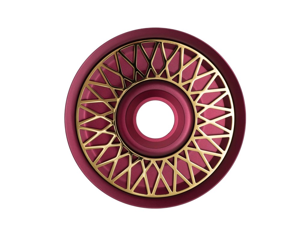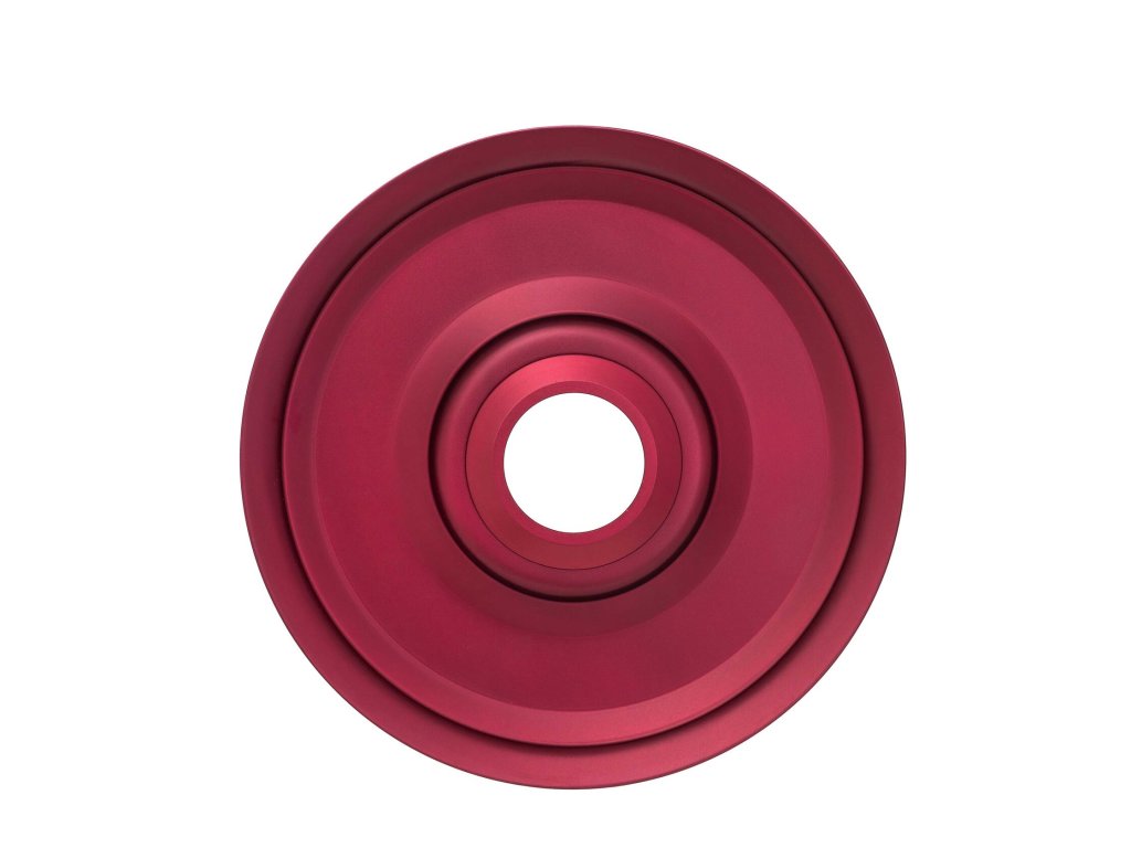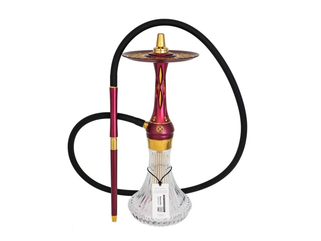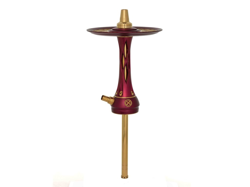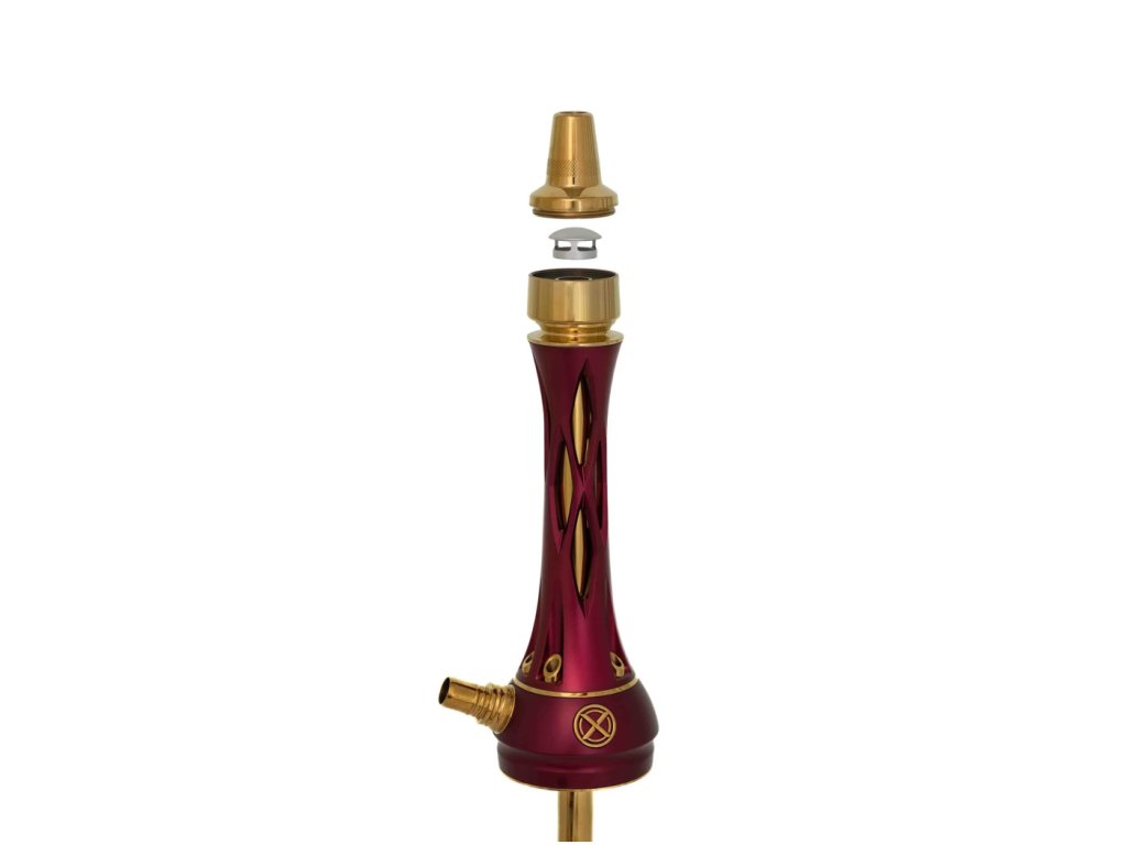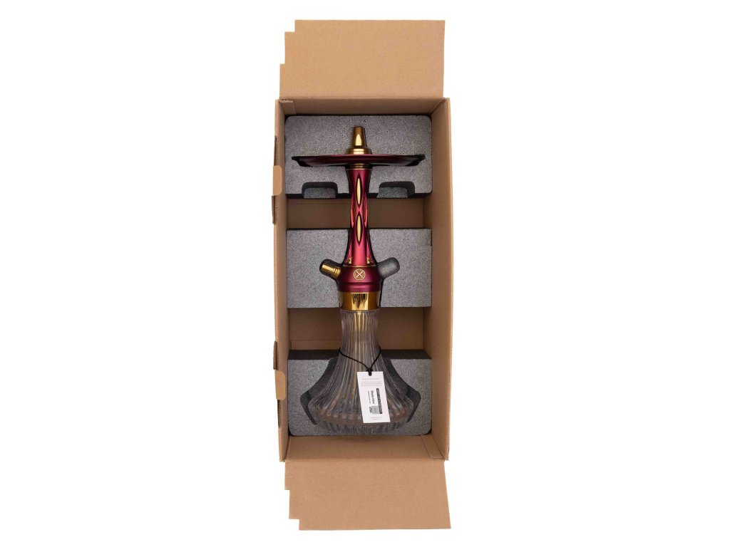 Tělo vodní dýmky, dřík a integrovaný zachytávač melasy jsou vyrobeny z nerezové oceli AISI 304 s povrchovou úpravou PVD, což zajišťuje maximální odolnost, čistotu chuti a dlouhou životnost. Dekorativní prvky jsou z eloxovaného hliníku a doplněny barevnou texturou Red, která dodává dýmce výraznou estetickou hodnotu.